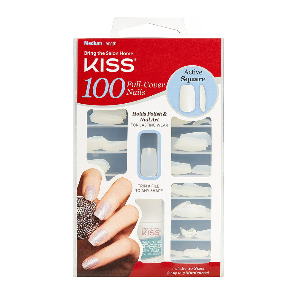 Kiss Full Cover Artificial Nail Kit, Active Square - 100 Ea