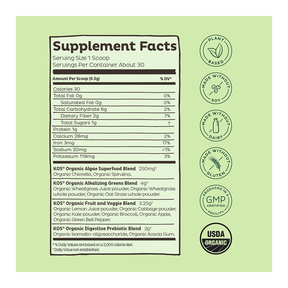 Kos Amazing Tasting Alkalizing Green Superfood Powder, Green Apple Sorbet Flavor, 9.38 Oz